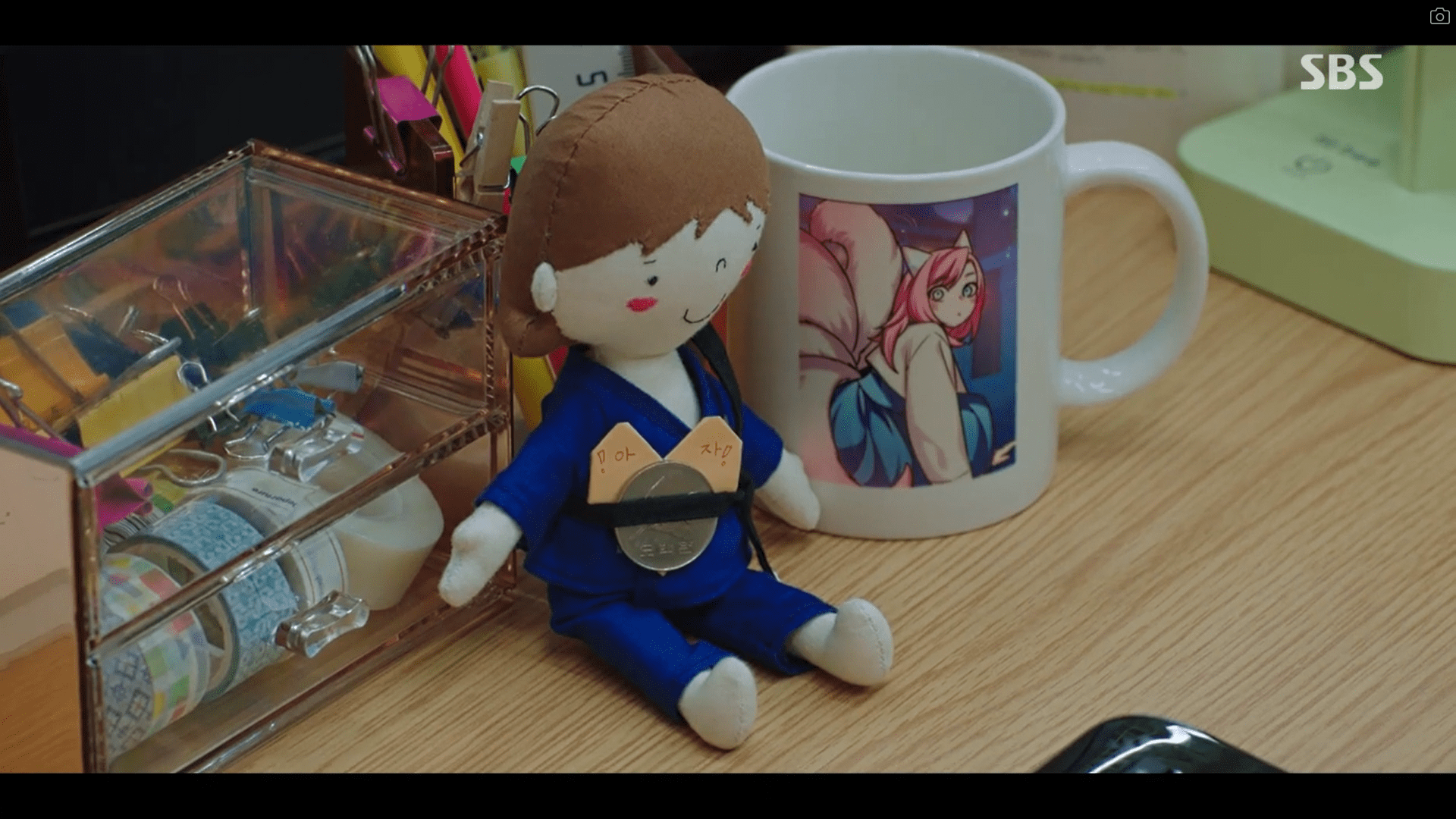 在做行政工作時總有許多文具小物散落在辦公桌上,劇中女主角溫心巧妙的將各種顏色的長尾夾和紙膠帶放在玫瑰金小抽屜中,前方搭配一個小玩偶,桌面頓時充滿可愛又療癒的氛圍!