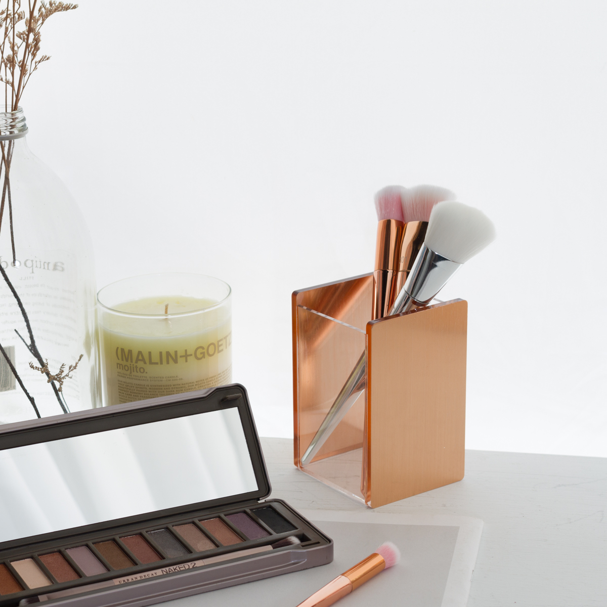 玫瑰金筆筒也可以收納美妝刷具。