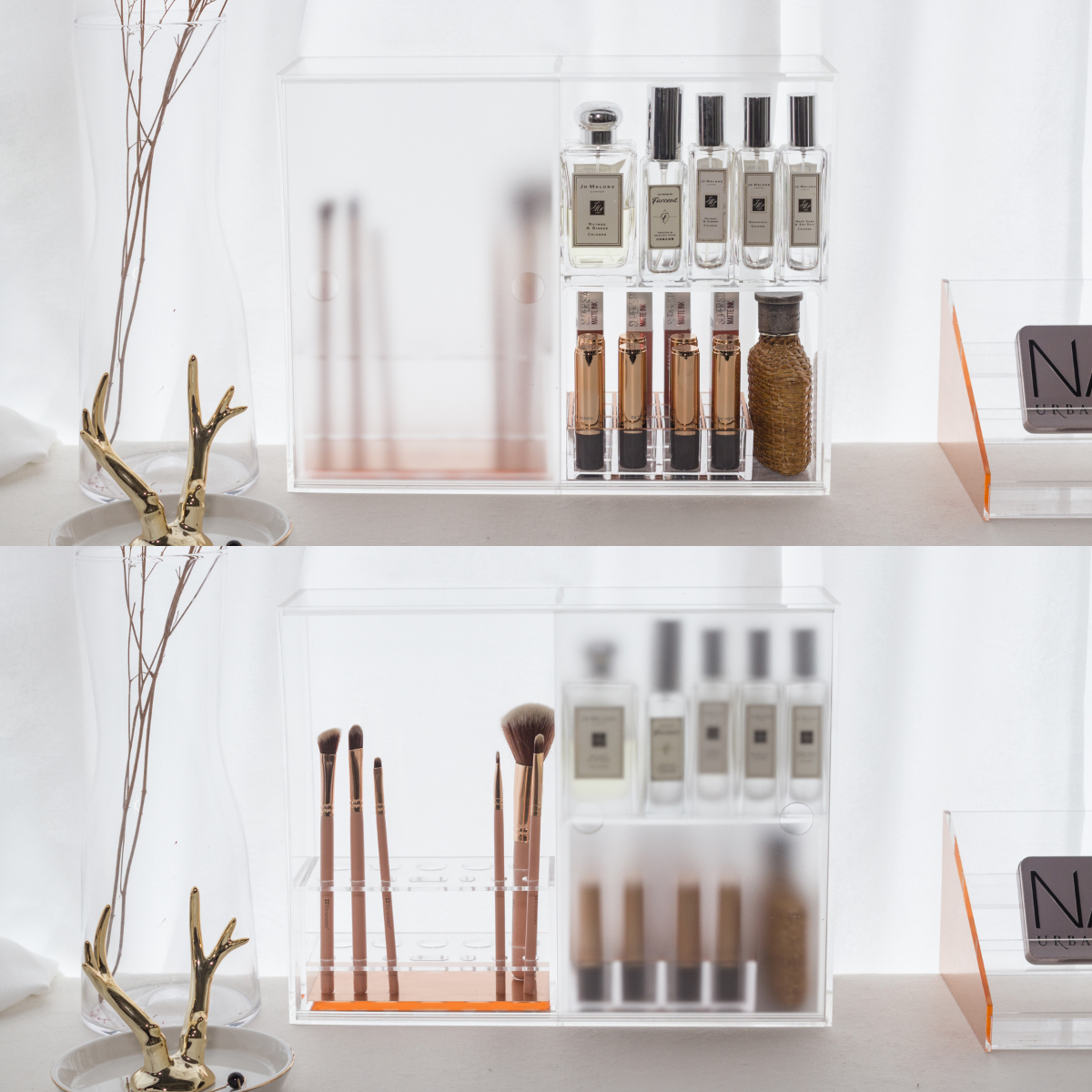 二格抽屜為MIT一級晶透壓克力製作,在雙邊鍍上不鏽玫瑰金刷紋,外觀精緻小巧,放在桌面上擺設剛剛好,也可收納其他美妝與飾品小物。