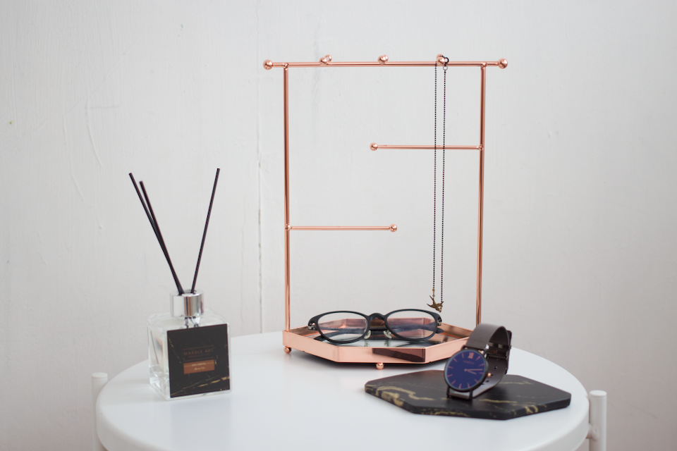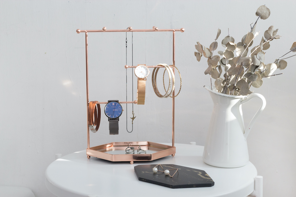 這種垂直的鐵架看似簡約,但其實很能放!它有三層橫桿可以懸掛,能夠將空間更好的分層,營造出高低起伏的視覺效果。底部還有六角形托盤可以放墨鏡等比較重的物品,是展示飾品類的好選擇~