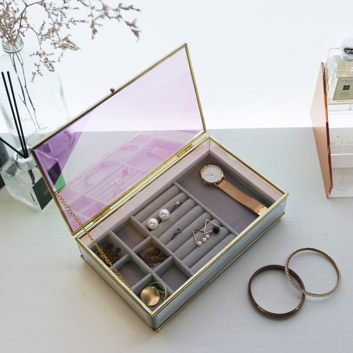 在一片深色系當中,擺放炫的極光飾品玻璃盒在房間,